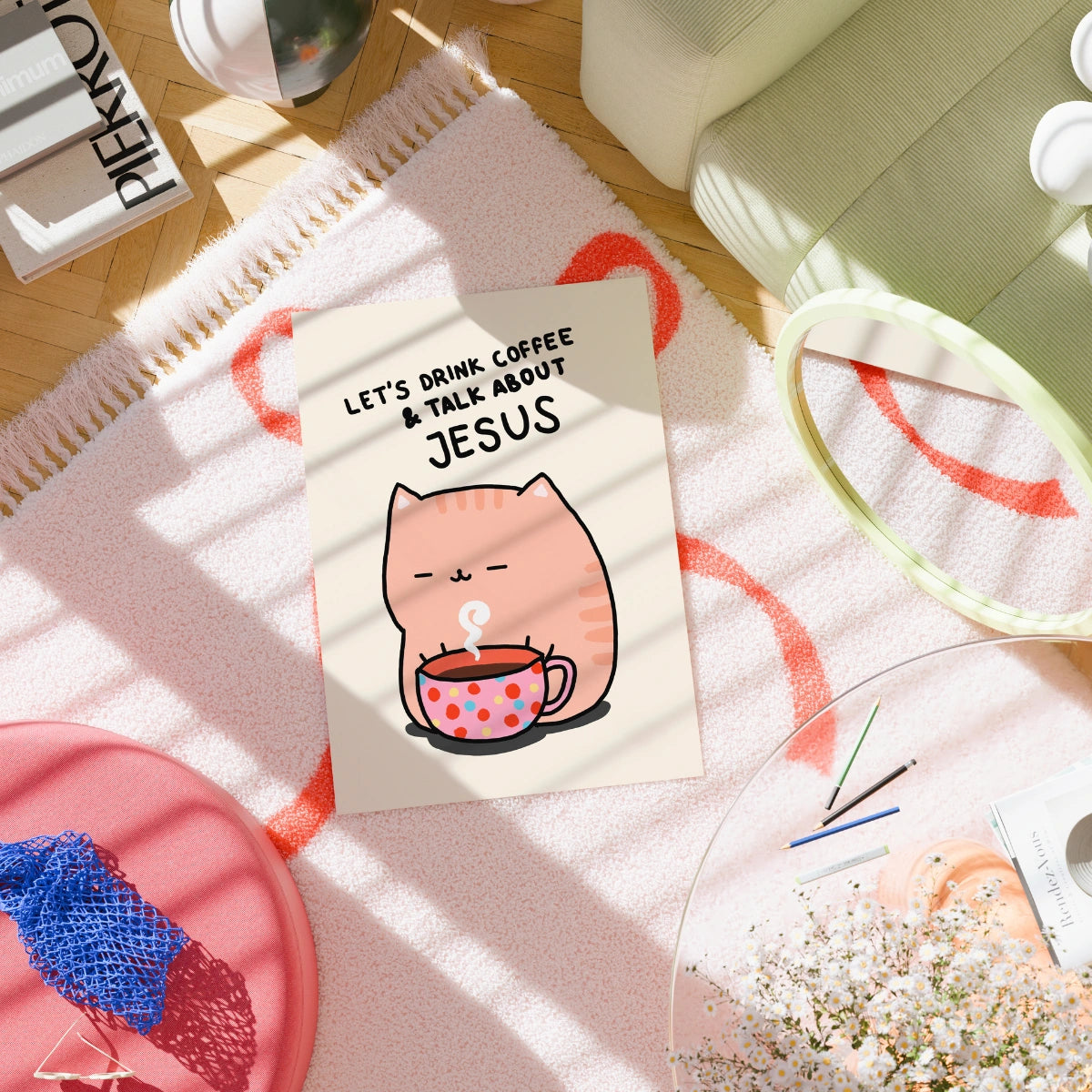 Stampa di caffè e Gesù – Arte murale cristiana con gatti